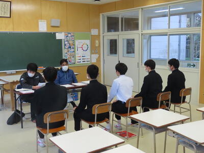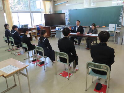2024年11月28日 07時39分22日(金)、3年生を対象に「企業面接講座」を実施しました。これは、一般企業の方々に来校していただき、会社の就職時の面接と同様に面接をしていただく企画です。参加してくださった方々の業種は、建築業、飲食業、廃棄物処理業、公務員、接骨院、ヨガインストラクター、美容師、眼鏡販売、販売業、自衛隊など多岐にわたります。この日のために練習をした3年生は、緊張しながら面接に臨み、目線や笑顔、姿勢や具体例を挙げた答え方など、多くのアドバイスをもらいました。「普段の言動が面接であらわれる」というのは、学校で教師から生徒に伝えていますが、ある企業の方は、全く同じことをおっしゃっていました。実際に高校入試で面接試験を予定している生徒のみならず、すべての3年生にとってとても貴重な体験となりました。