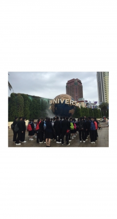 2015年4月13日 12時25分ほぼ予定通りにUSJに着いて記念写真を撮りました。集合時間や場所を確認してから入場しました。小雨が降っていましたが、今は上がりました。