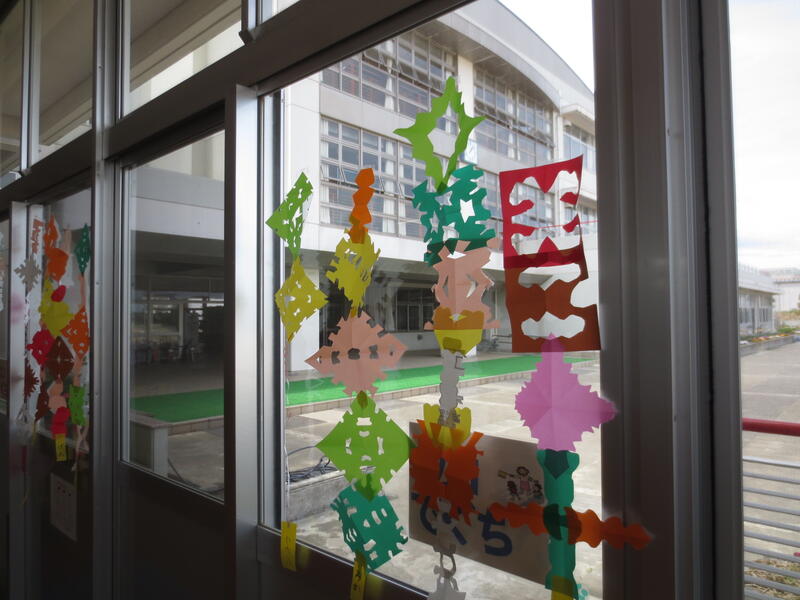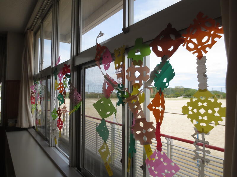 重ねて切ってできたさまざまな模様の色紙を窓際に飾っていたのでした。