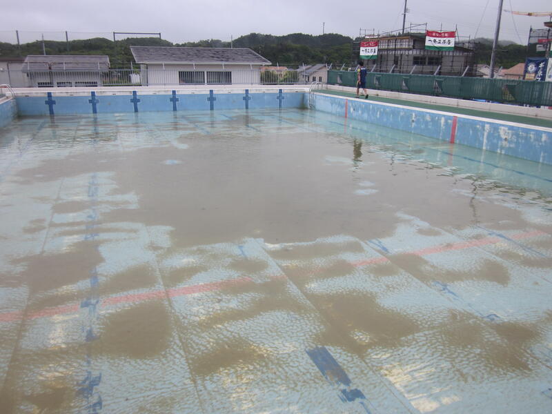プール清掃は約3年ぶりです。たまっていたプール水の排水を終えると、ご覧のような状態になりました。本校のプール施設はまだ比較的新しい方ですが、それでも長年の汚れはたまっているようでした。