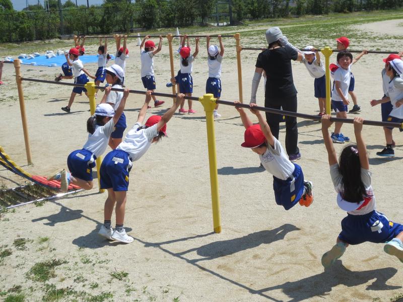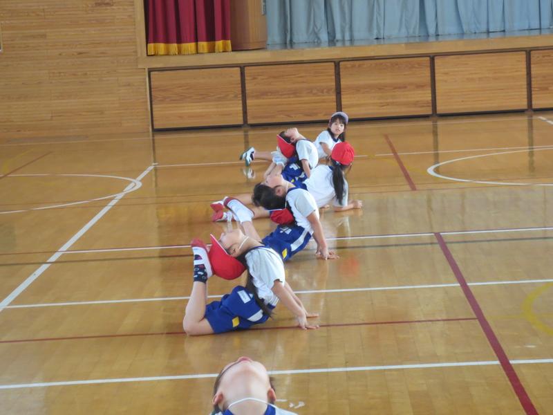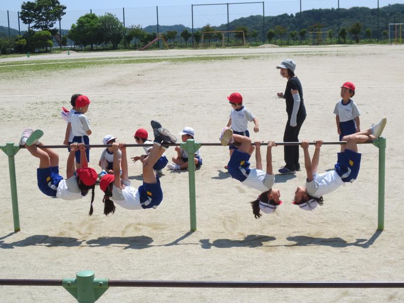 2019年6月26日 11時55分1年生は体育です。体が柔らかいのには驚きです!鉄棒も豚の丸焼きや布団干しなど楽しそうに行っていました。1年生からこんなにできたらこれからが楽しみですね