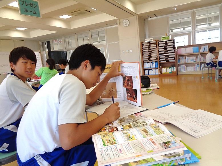 6年生は、社会科で図書による調べ学習を行っています。プレゼンルームでの調べ学習は涼しくて快適、頭にどんどん入っていきます。外国語学習や理科の実験も行っていました。6年生はやることがいっぱいありますが、明後日楽しい見学学習があるのでがんばっています。明日もがんばります