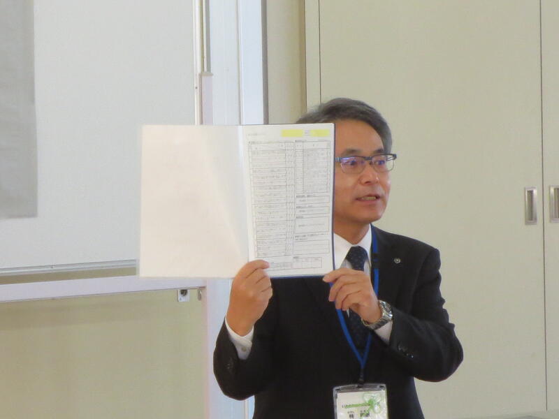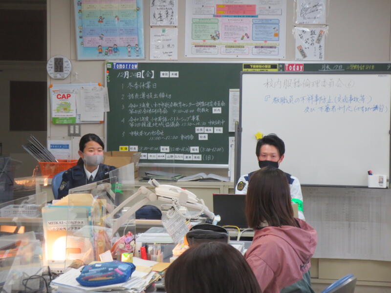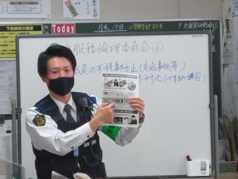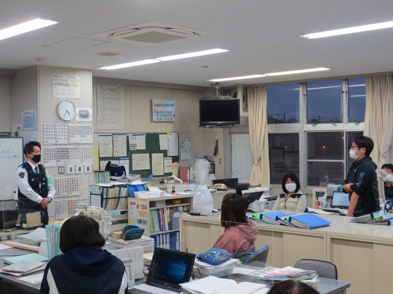 服務倫理委員会として、いわき中央警察署中央台交番の署員様2名を講師に迎え、自家用車運転の際の速度超過や交通事故の防止、また来校者に不審者がいた場合の対応についてお話を聞くことができました。