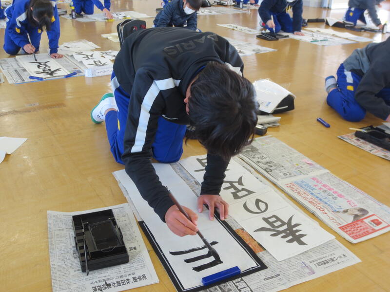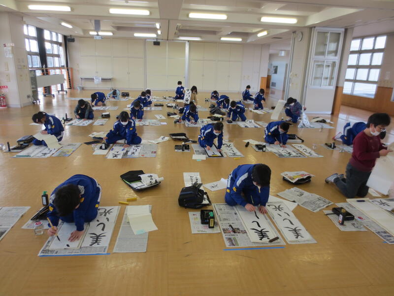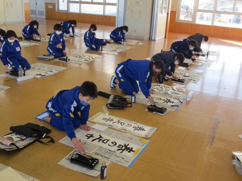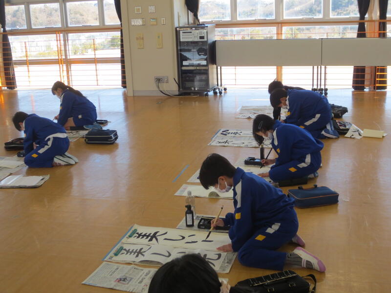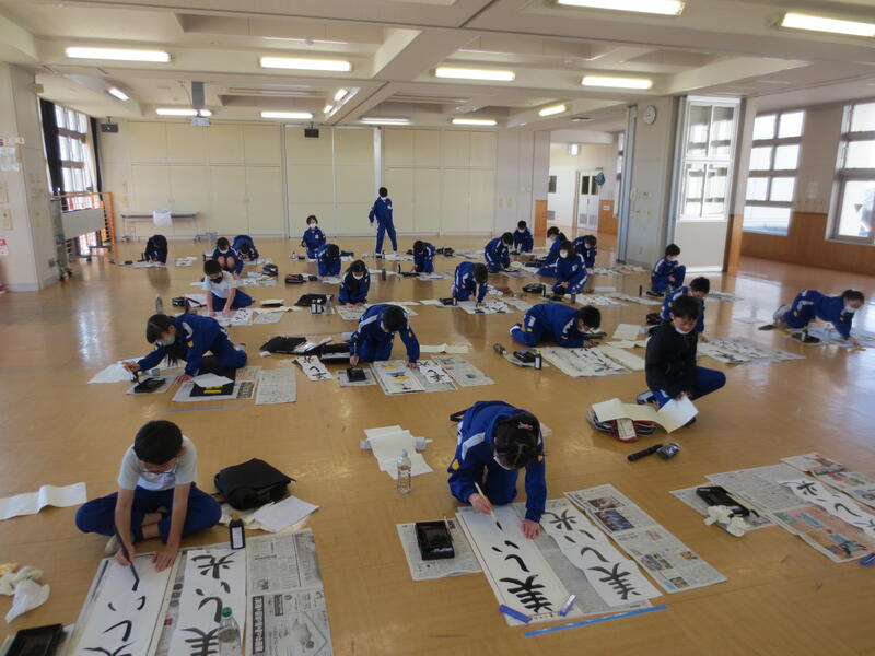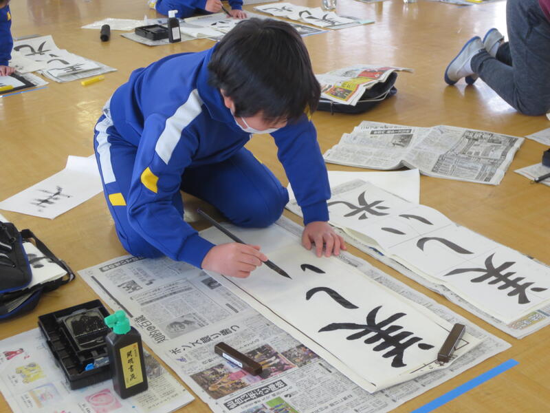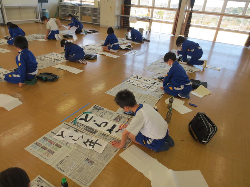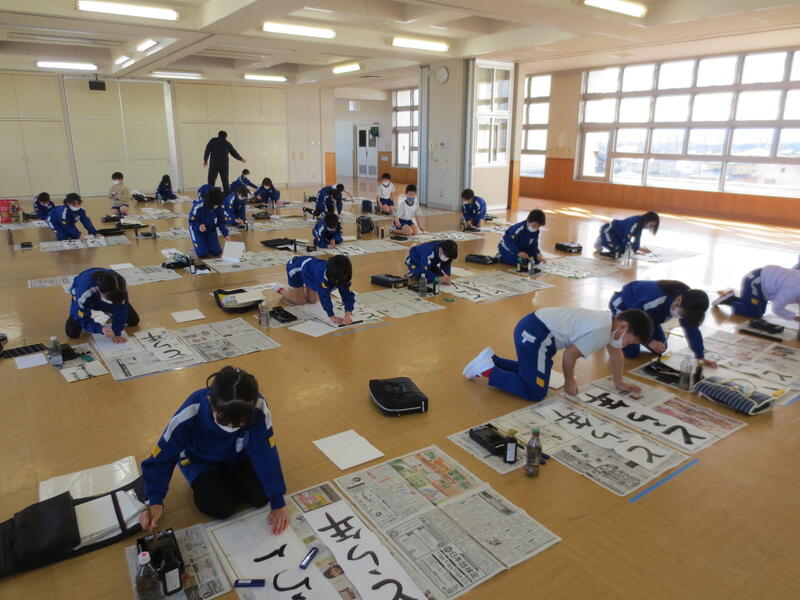 本日の校内書き初め会は3校時に4年2組が、5校時に3年2組が行いました。