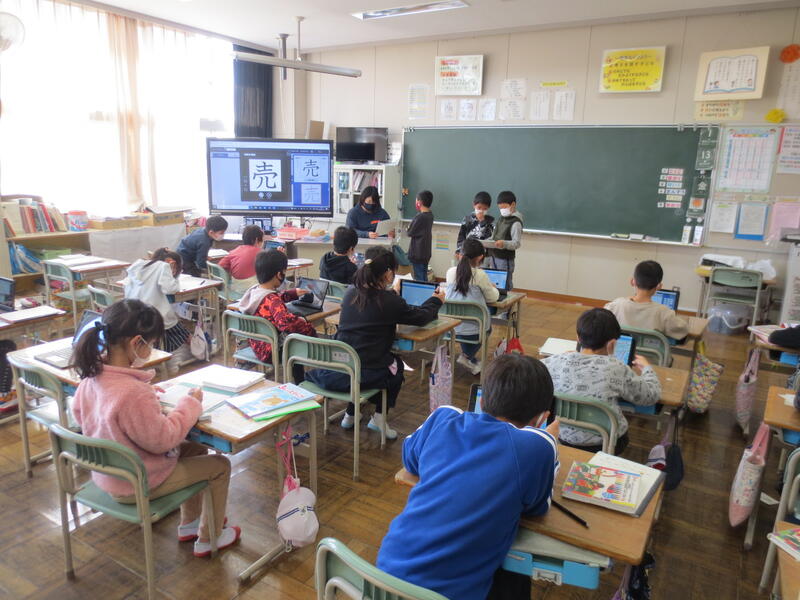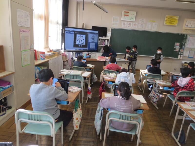 大型モニターやタブレットを活用して、漢字学習に取り組んでいます。先生にも確かめて見てもらっているようです。