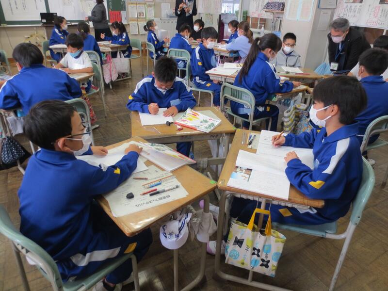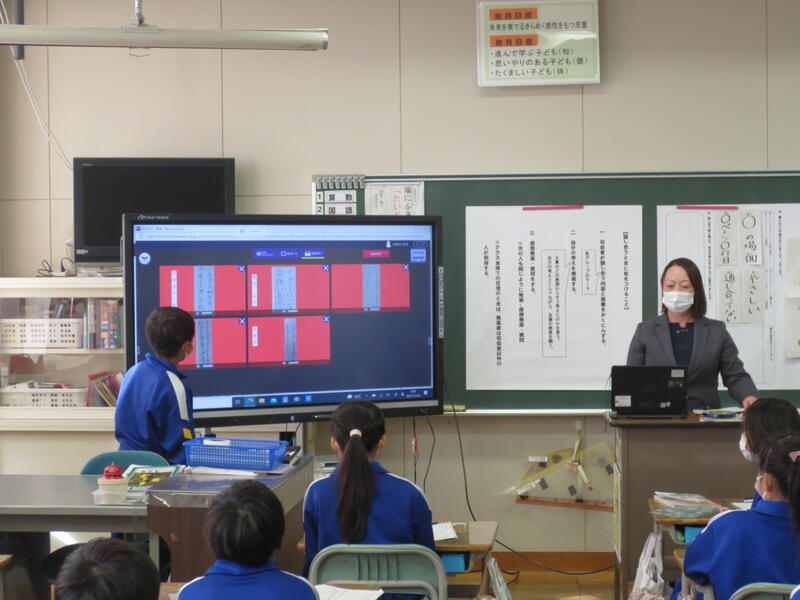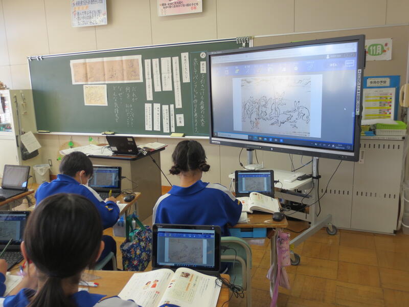 鳥獣戯画の魅力が伝わるパンフレット作りを考えるという内容でした。読み手を引きつける工夫をするために、見出しや紹介文に使う言葉の選択が問われるのですが、さすが6年生、センスが光る考えを次々に発表しているのが印象的でした。