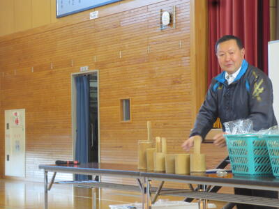 けん玉の前に、二つに割ってけん玉よりもやりやすくしたような竹のものを使って、姿勢やひざの使い方などを、実際に技を体験しながら学んでいきました。