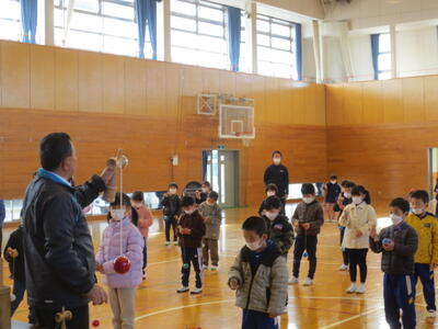 講師の先生が子供たちにお手本を見せるためのけん玉が大きいのに、1年生もビックリ!!