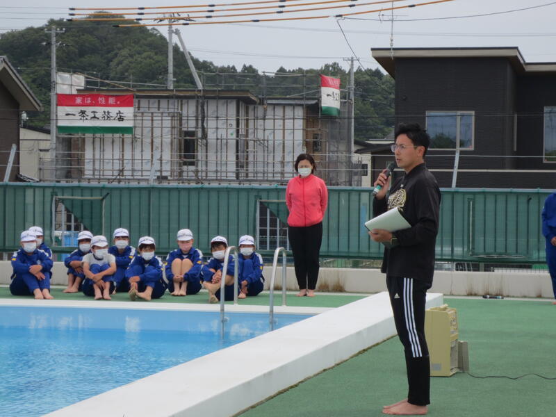校長先生から、水泳学習で大切なことや守ってほしいことなど、ご自身の体験を交えてお話がありました。
