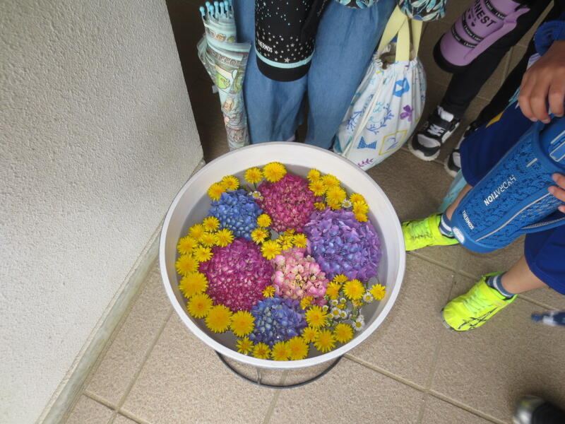 校長先生が入れたあじさいに、子どもたちがたんぽぽなどの花を入れて、「ほっと一息!オアシススポット」が完成しました。昇降口にあるので、登下校の際に、児童がよくのぞきにやってきています。
