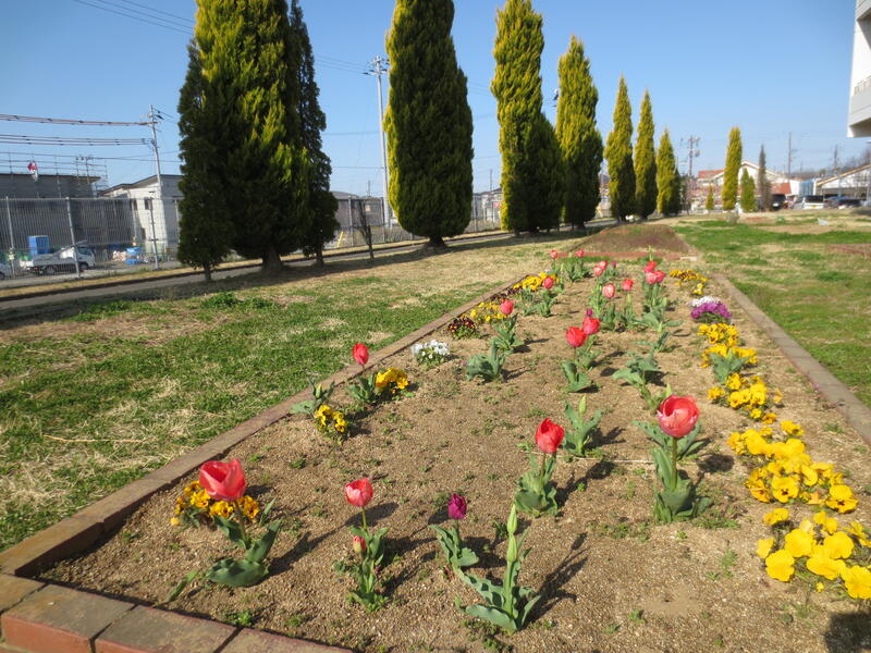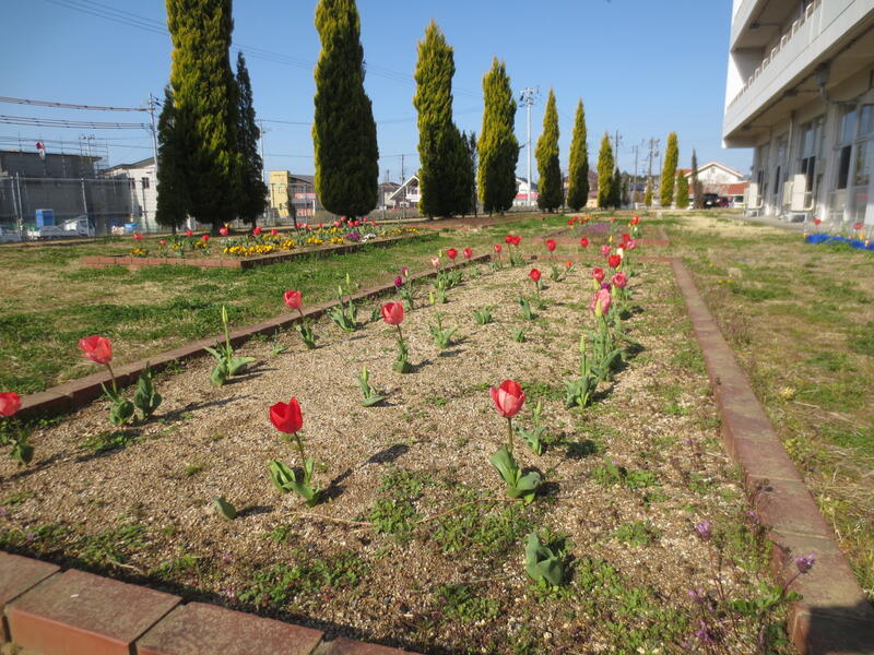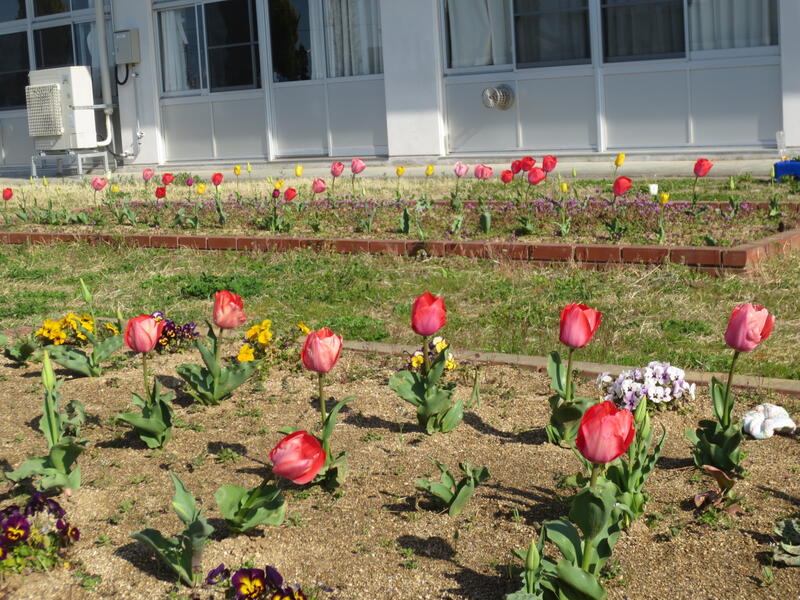 1・2年生教室前にある花壇には、チューリップがたくさん植えられています。
