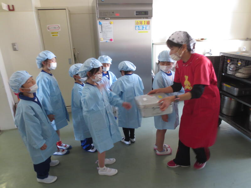 当番になったお友達は、エプロンを着け、何を持つか分担して、先生から受け取りました。