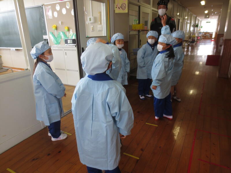 準備が終わったら、当番さんはエプロンをたたみます。たたみ方を先生が分かりやすく教えていました。