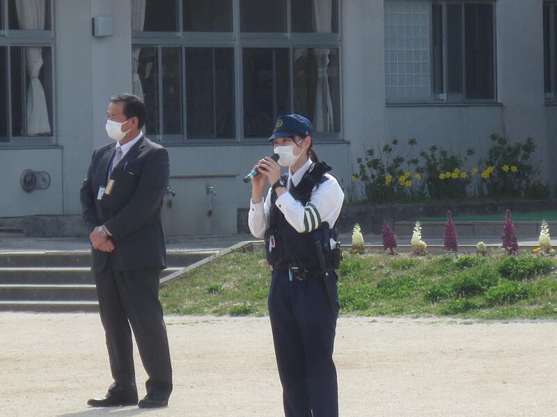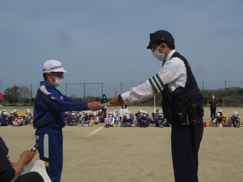 中央台交番のおまわりさんからもお話をいただき、「家庭の交通安全推進員」となる6年生の代表児童へ委嘱状を渡していただきました。