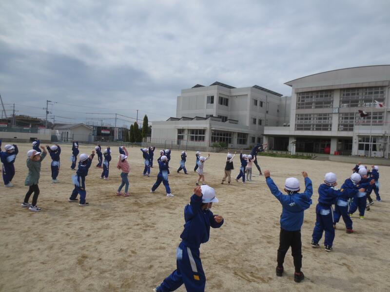 現在は、本校では密を防ぐ目的で、奇数学年と偶数学年で分け、校庭の使用を一日おきに交代で使用しています。