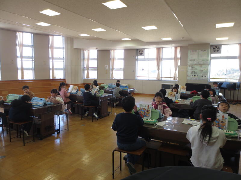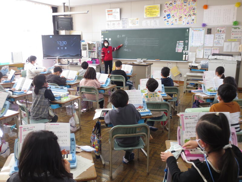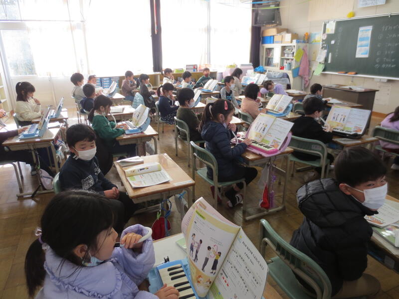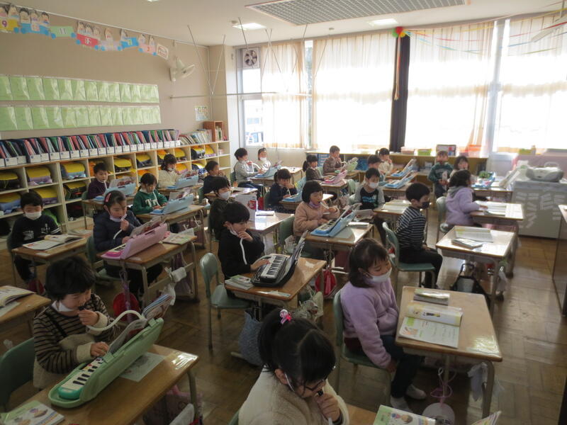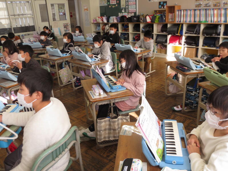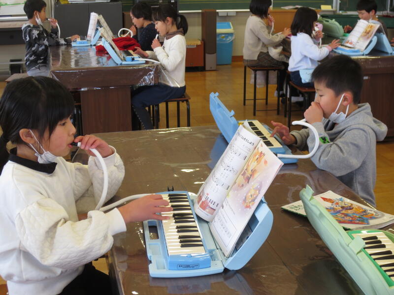 先生の伴奏に合わせて、鍵盤ハーモニカの練習をしていました。