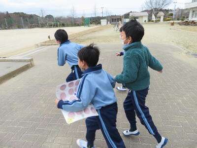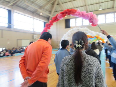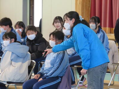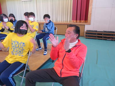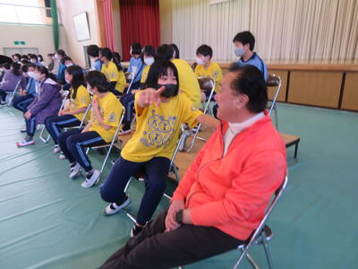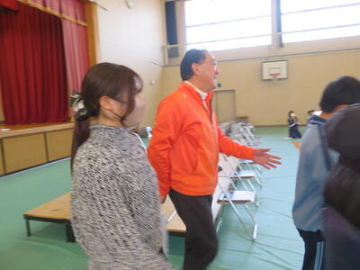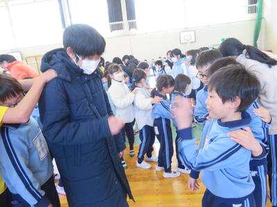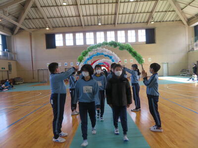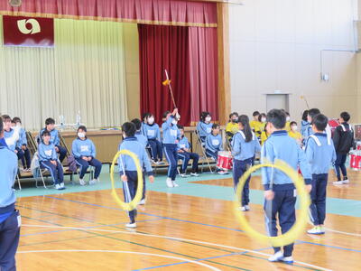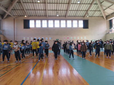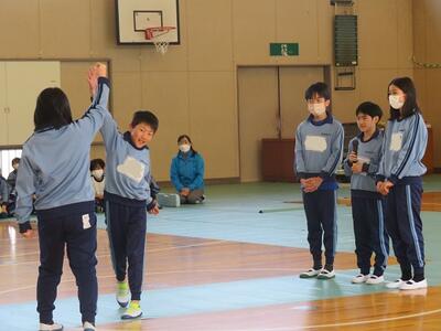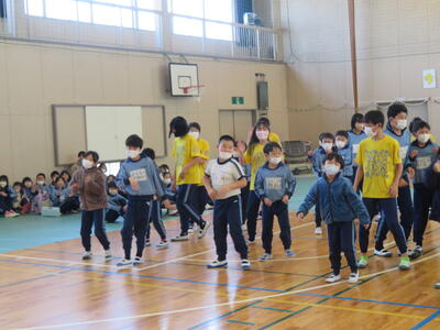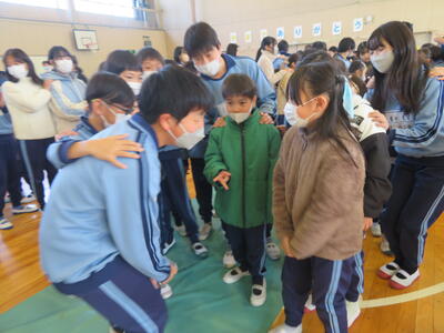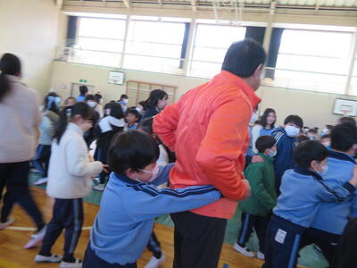 1・2年生と6年生でじゃんけん列車。5年生がお手本を示まします。