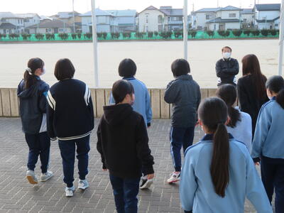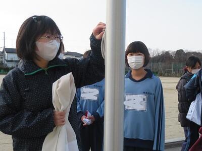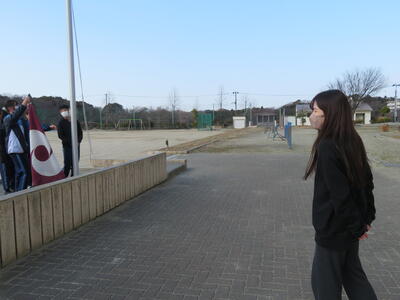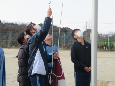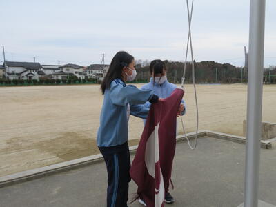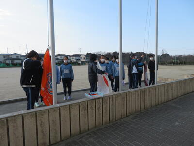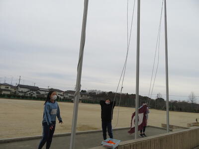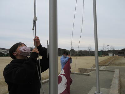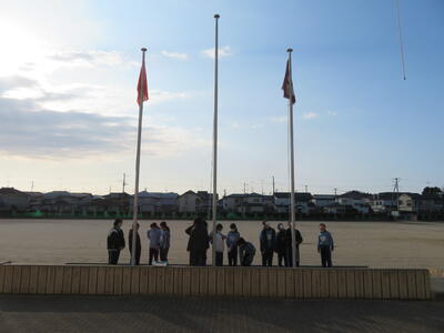 月曜の朝。国旗・校旗をあげに代表委員会の児童。