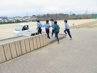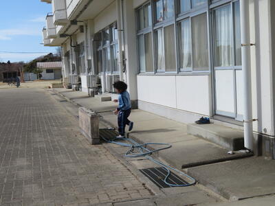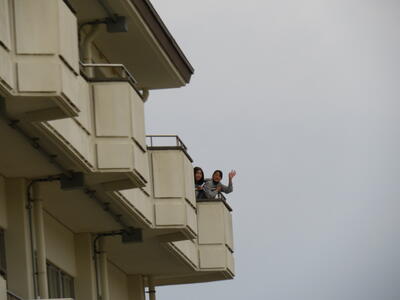 「がんばれ~5年生。」6年生が心配してベランダから励ましの声をかけます。
