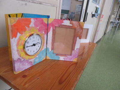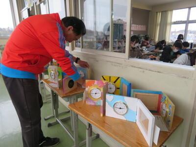 6年生の先生。廊下に卒業制作の作品を並べていました。