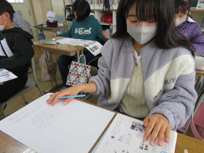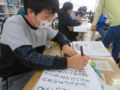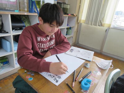 「筆ペンを使ってどんな文章を書こうかなぁ。」迷ったときに「困っている」と言える子。先生の隣に席を移動して。