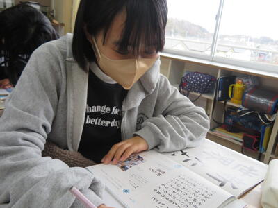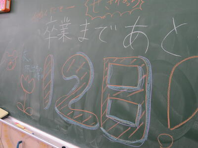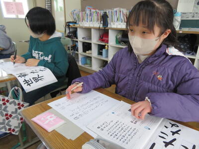 「いい字書くね!」先生が大きな声で褒めています。背中の黒板には12日の文字。