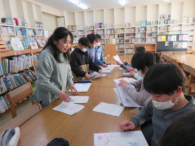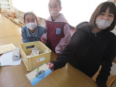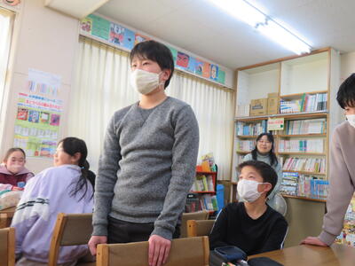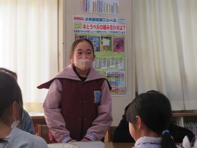 図書委員会、1年間の反省を一人一人発表。4年生「初めての委員会で図書委員会を選んでよかったです。」
