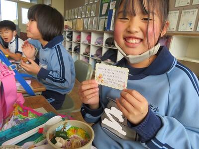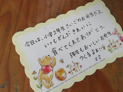「今日は、小学2年生さいごのお弁当だよ、いつもぜんぶきれいに食べてくれてありがとう。3年生もおいしいお弁当つくるよ!!」