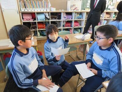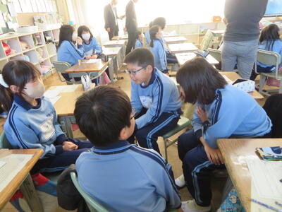 みんなの意見を出し合った後は、またグループになって賛成や反対意見を考えます。聞き方も身についています、体を向けて全身で聞こうとする態度。