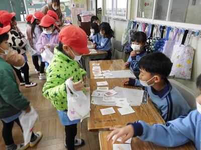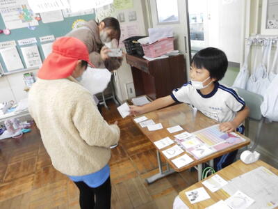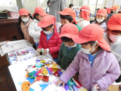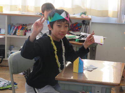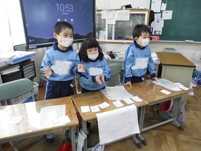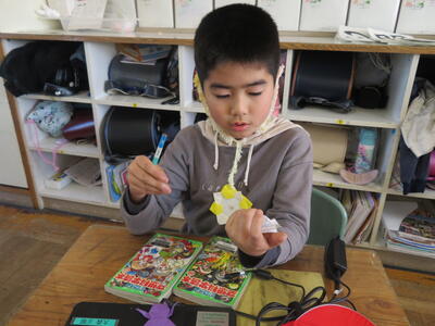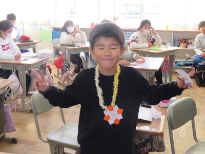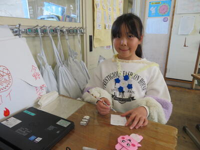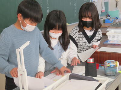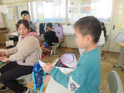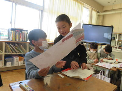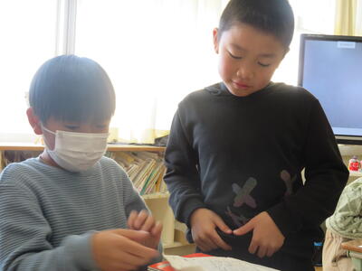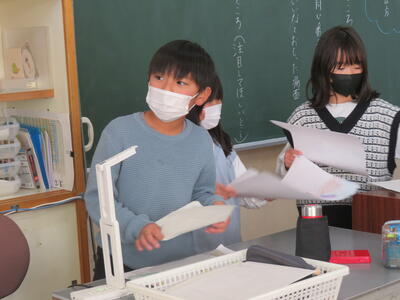 「和紙で作られているの?」「手作業?」「木から作った?」これまでの和紙の学習や、こけし工房に見学学習へ行った体験が生きている子供たちのつぶやき。