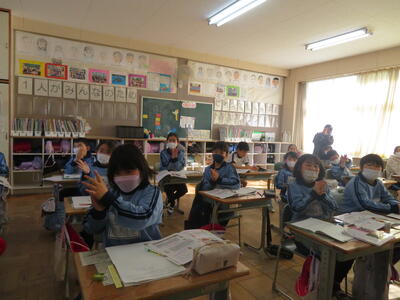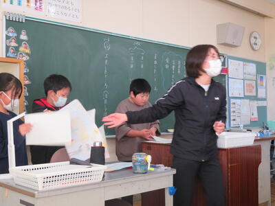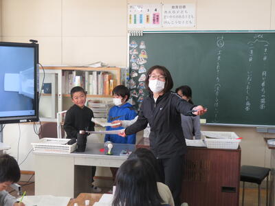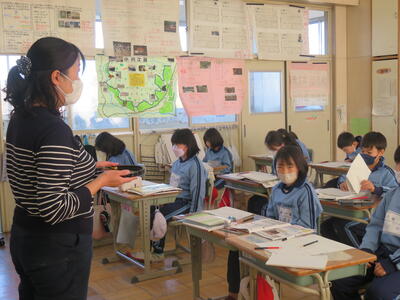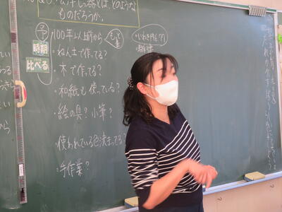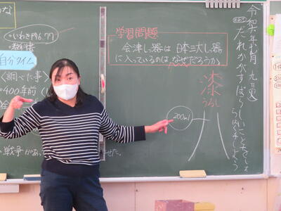 4月の社会の学習を振り返る先生。子供たちは会津に伝統工芸品が有名であることを資料から読み取っていました。では、会津の伝統工芸って???