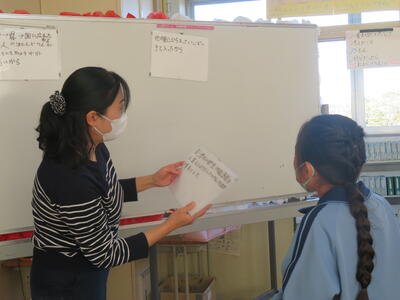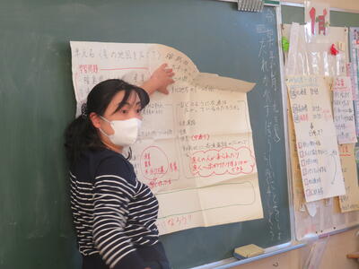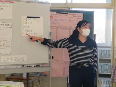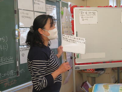 先生が子供たちが書いたものを読みながら黒板に貼っていきます。3つに分類して。