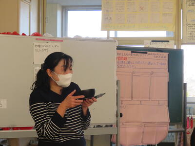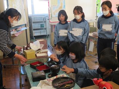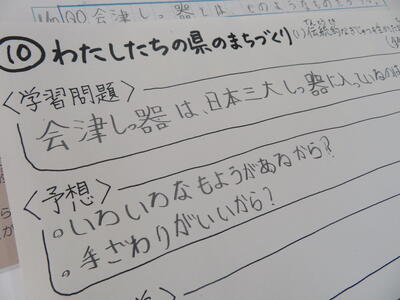 会津漆器を実際に手に取って、目の前で見たことで学習問題につながるよう予想や疑問が次々と。