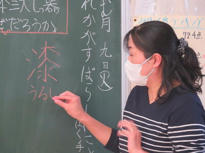 先生が漆器の「漆」の文字に戸惑う子供たちに書き方を説明しながら「うるし」と読むことを教えます。