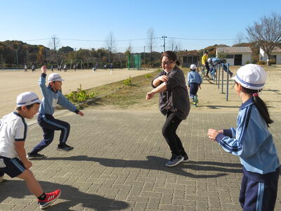 子供たちが一番楽しい相手は担任の先生。「先生の背中を狙え~」
