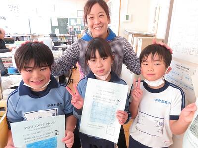持久走チャレンジカード。2年生、おめでとう!3年生の先生からハンコをもらって。