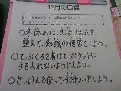 児童会の子供たちが考えためあて。みんなで守って安全に健康に!