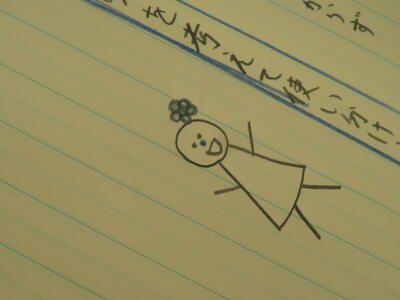 棒人間の絵を描いて。「ここに『はな』をつけてみて。」先生の指示でそれそれの思う『はな』を描きます。