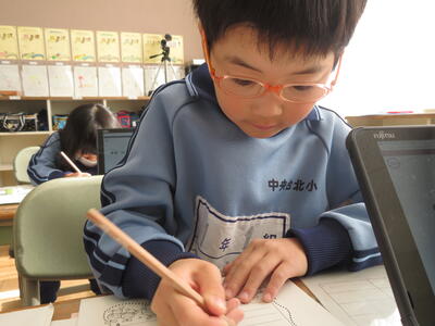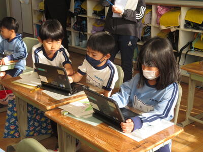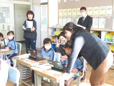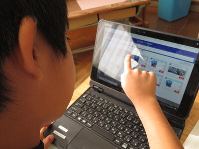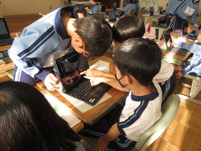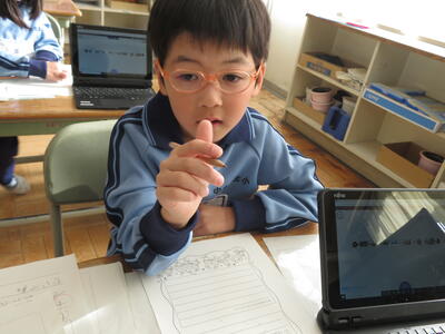 タブレットを使って、これまで観察してきた朝顔の様子を振り返ります。