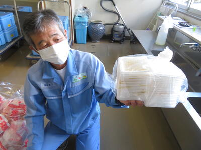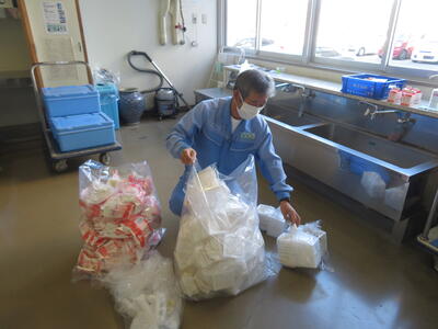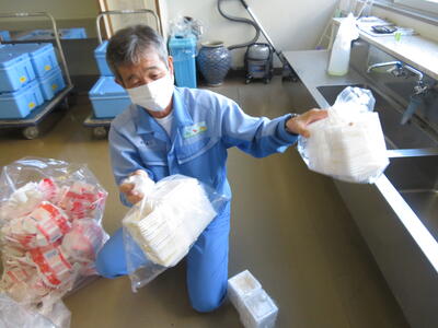 今日の給食は納豆が出ました。片付け中の用務員さん。