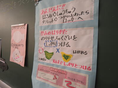 作り方に迷うと、頼りになる黒板の掲示物。子供たちは安心して制作に没頭します。