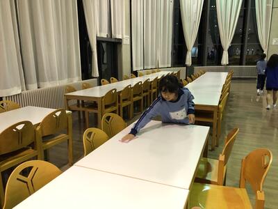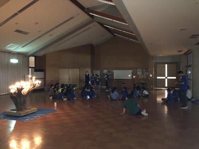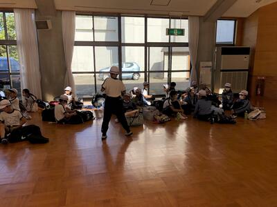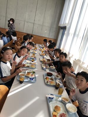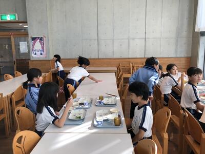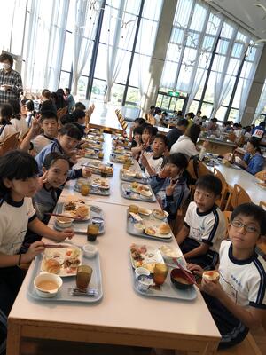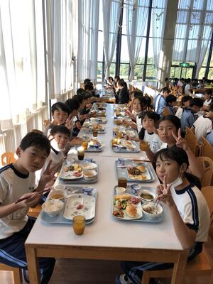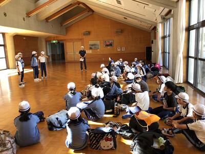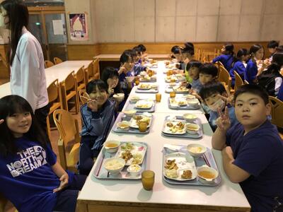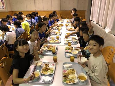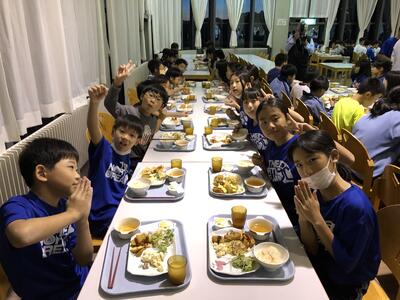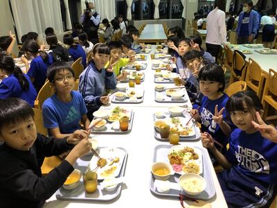 宿泊活動二日目。班長会議からスタートです。朝の掃除や片付けなどをしてから朝食をいただきました。
