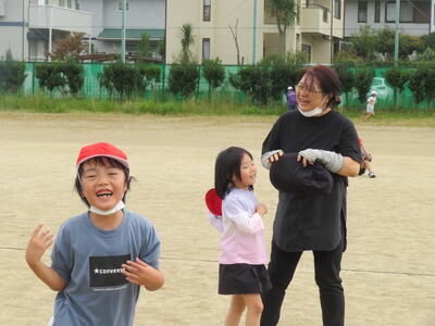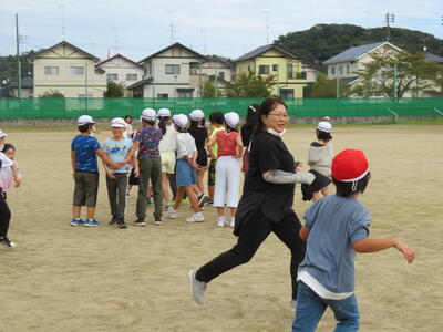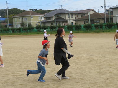 ぎゅんぎゅん走る1年生の先生。鬼ごっこ。