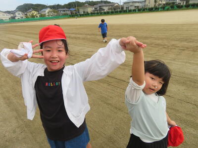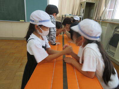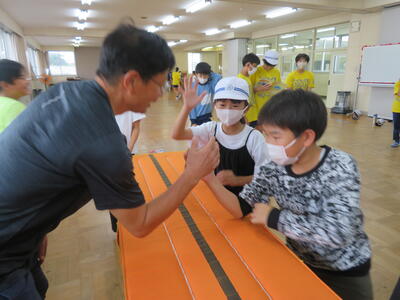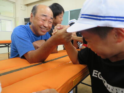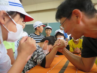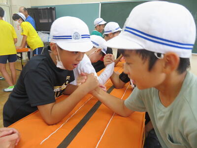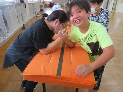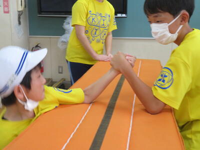 外での活動は雨のためにできなかったけれど、腕相撲に変更して楽しい時間となりました。