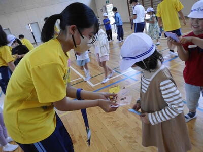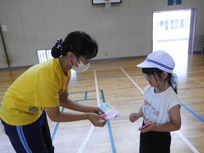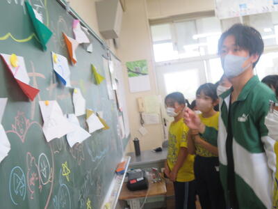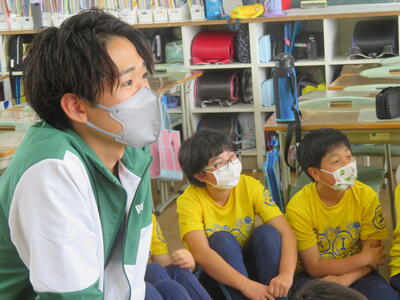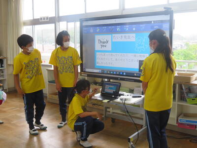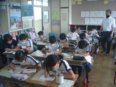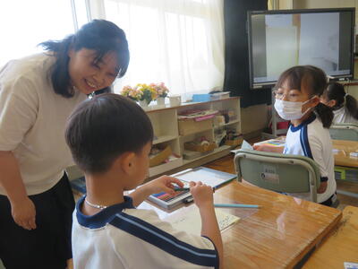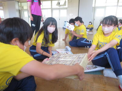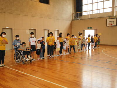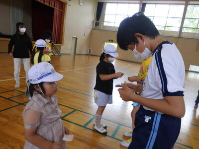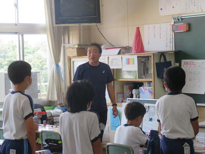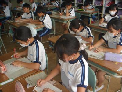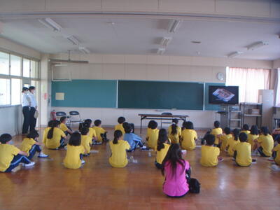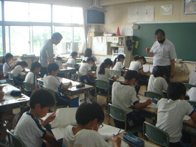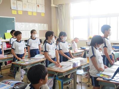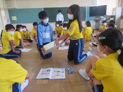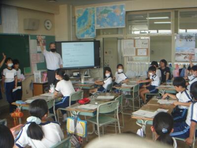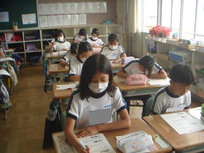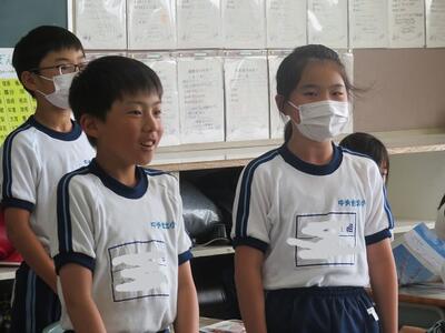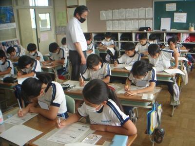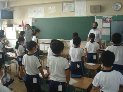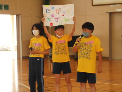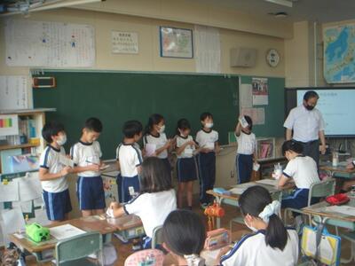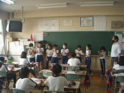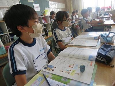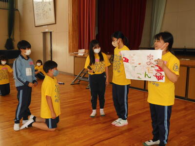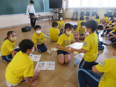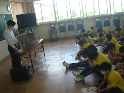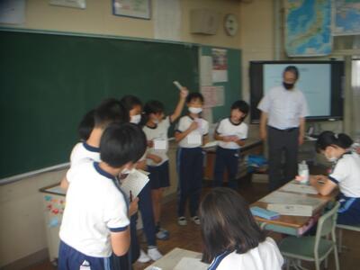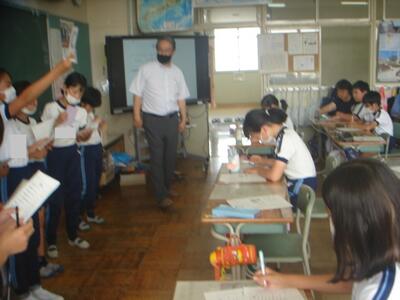 5年生が、人権擁護委員の先生を講師にお迎えして、人権教育について学習しました。はじめに「はぁ」ゲームというゲームをしました。8人の代表の皆さんが言葉と表情だけで伝えた「はぁ」という言葉がどういう場面での「はぁ」なのかを考えました。全部の場面を当てることは難しく、言葉だけで気持ちを伝えることの難しさについて学びました。