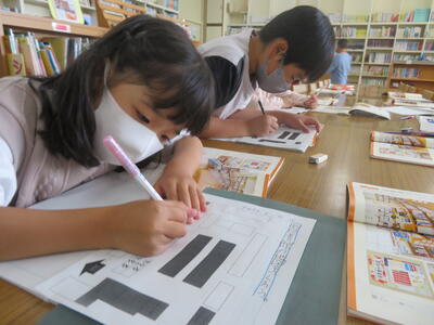 今日は、図書館の利用方法を身につけます。図書館マップに、どこにどんな本があるかを調べて。