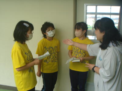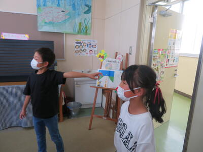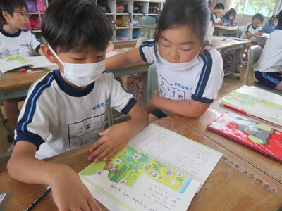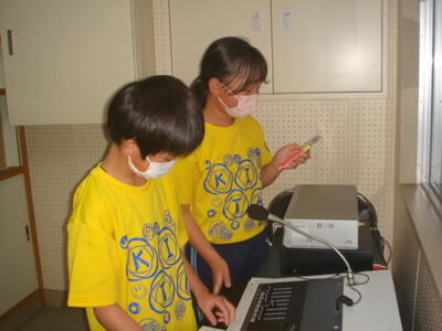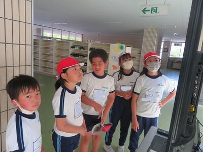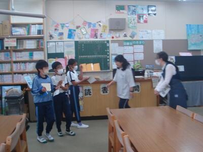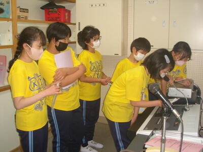 2023年5月23日 10時21分大休憩の時間に、図書委員会の5・6年生がお昼の放送で「おすすめの本」を紹介する練習をしていました。