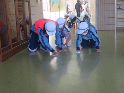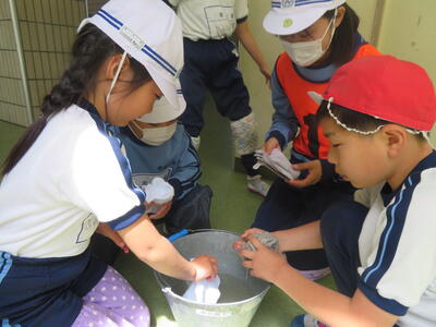 運動会が終わって、1年生もお掃除に参加。雑巾の絞り方を教えている様子。