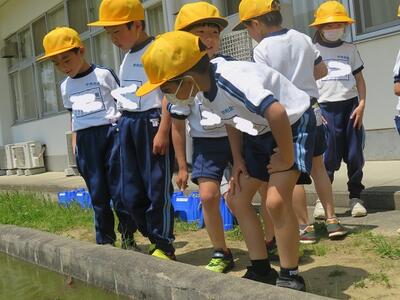 並べた後は、やっぱり気になる池の亀。3年生からの社会科では課題に気づくことができる子を育てていきます。その素地は生活科から。たくさん遊んだ子は、たくさん気づくことができる子に育ちます。