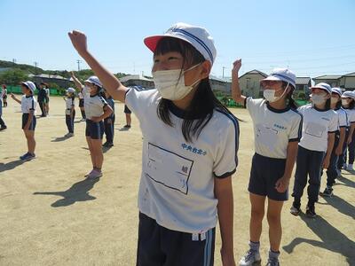 閉会式では万歳三唱、3年ぶりの実施。万歳の仕方を覚えます。